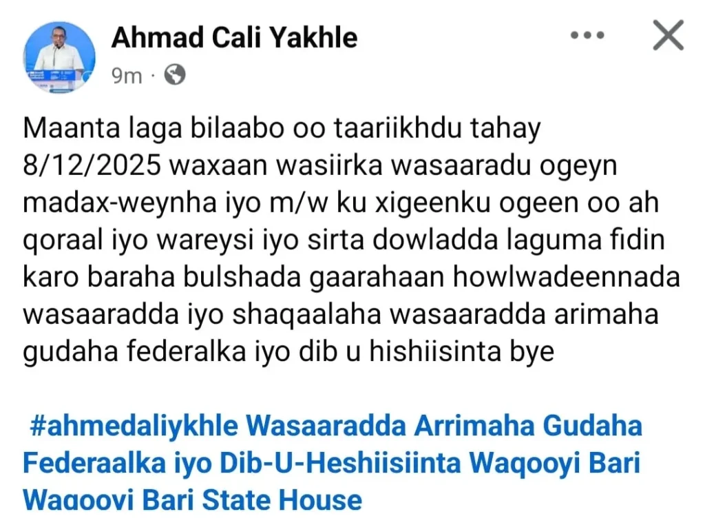 Qoraal uu bartiisa Facebook ku daabacay wasiirka arrimaha gudaha Waqooyi Bari Axmed Cali Yakhle ayaa mas’uuliyiinta xukuumadda ka joojiyey ka hadlidda xaaaladaha-siyaasadeed, iyada oo aan la sheegin karin ‘wax aan’ Madaxweynaha & Ku-xigeenku ogayn.